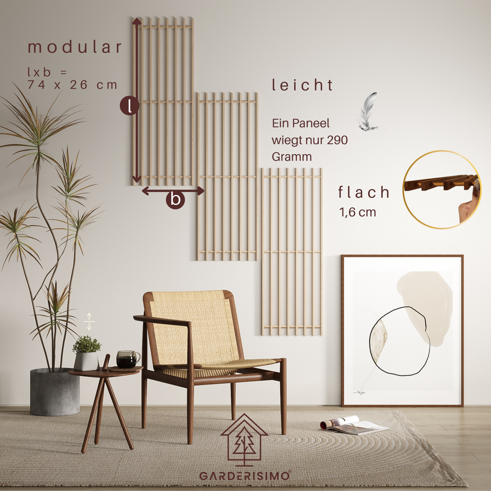 - 🏡Design: die Wandpaneele von Garderisimo im Japandi-Stil werten jeden Raum auf und eignen sich als dekoratives Wandelement. Japan Style trifft auf skandinavischen Flair. Diese Paneele sind im künstlichen Licht Schwarz, und bei Tageslicht Aschbraun.